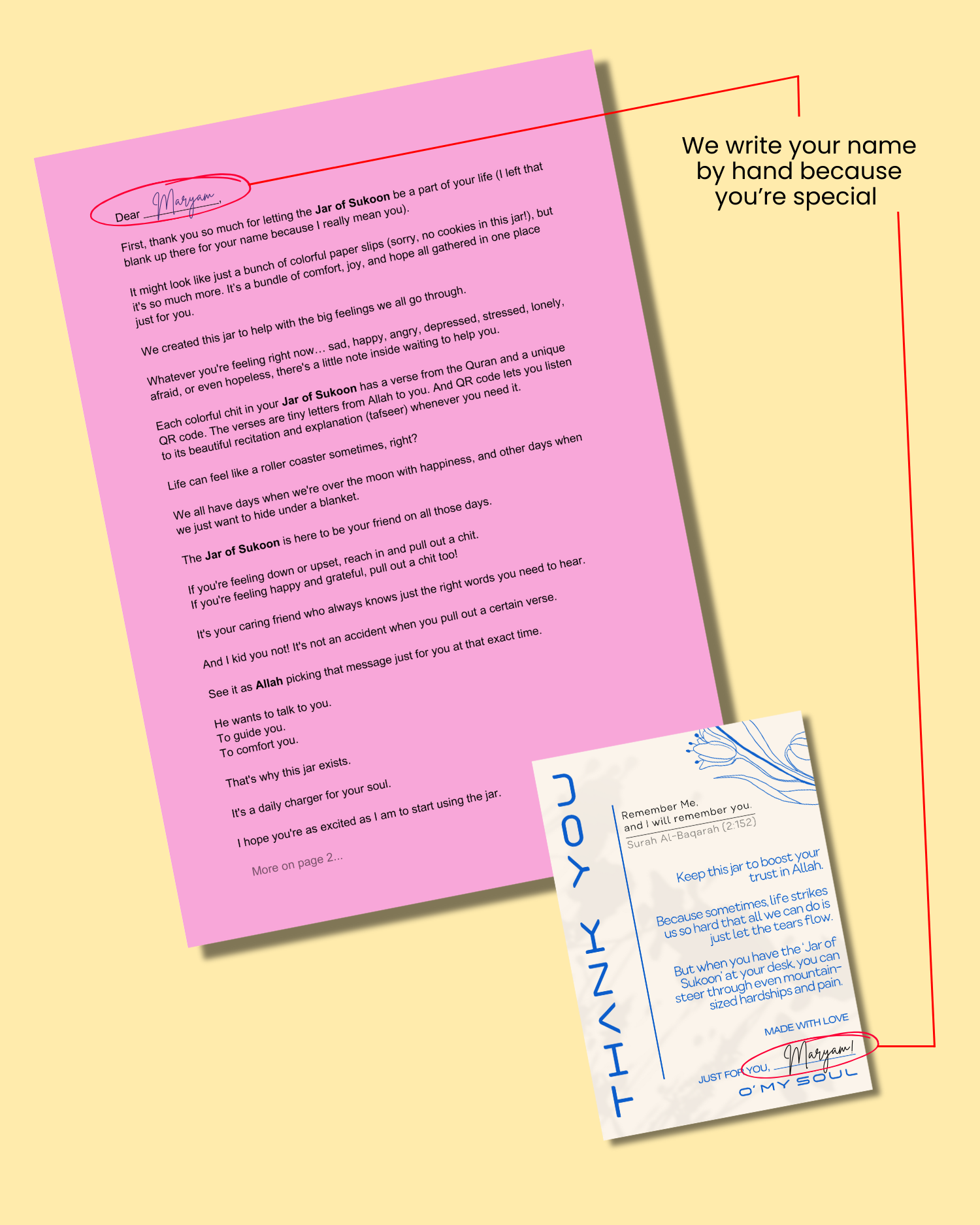 1 Jar, 8 Colors, 112 Verses, QR Code, My Reflections Section, Named Letter, Named Thank You Card and 2 Jar Options filled with LOVE.